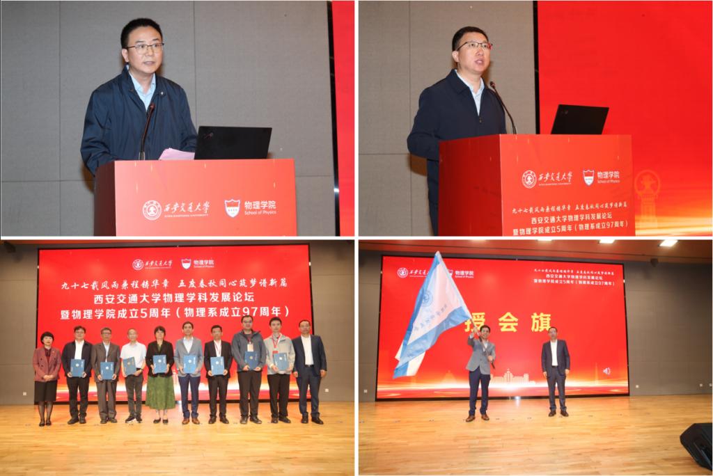 9月21日,西安交通大学物理学科发展论坛、物理学院成立5周年暨物理系成立97周年大会在中国西部科技创新港举行。西安交大校长、中国工程院院士张立群,中国科学院院士、西安交大电信学部侯洵,中国科学院院士、西安交大电信学部主任管晓宏,中国科学院院士、中国科学院近代物理研究所赵红卫,中国工程院院士、北京应用物理与计算数学研究所胡晓棉,西安交大党委常委、副校长严俊杰、单智伟,西安交大原党委常务副书记、国家教学名师王小力,西安交大原党委副书记、纪委书记赵军武,中核集团中国原子能科学研究院副院长郭冰,小米集团党建顾问、行政部总经理张少亮等出席大会。