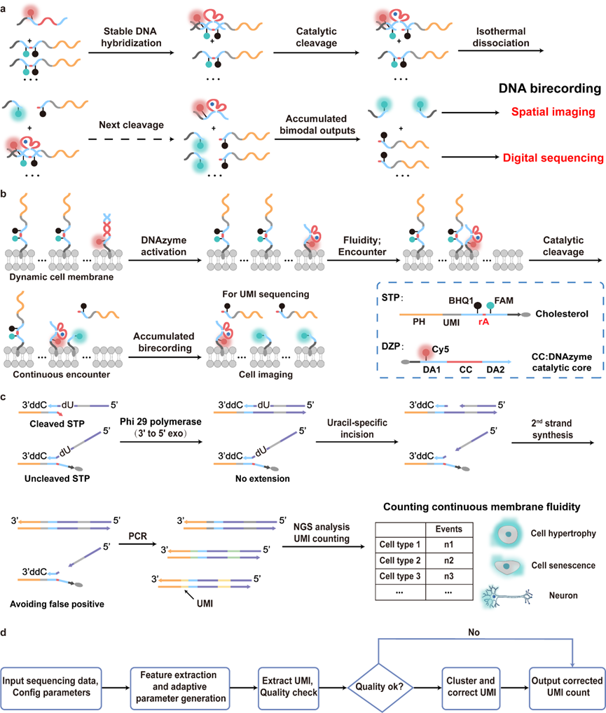 近日,西安交通大学赵永席、陈锋教授团队构建了一种名为生物物理转DNA催化累积双记录仪(Biophysical-to-DNA Catalytic Cumulative Birecorder,BioDIMER),该方法将动态DNA纳米技术与独特分子标识符(UMI)测序相结合,成功实现了对活细胞膜流动性连续事件的双模态、累积式记录:既能通过荧光成像进行时空可视化,又能借助DNA测序进行数字化绝对定量。BioDIMER系统实现了对细胞膜流动性的“写入及锁定”式记录。其核心是一对膜锚定DNAzyme探针,一旦因膜流动而相遇,便催化切割反应,同步产生原位荧光信号与携带唯一UMI的DNA片段。前者形成动态荧光图像,后者则实现事件的数字化定量。由此,新事件的加入不会覆盖原有记录,确保了膜流动历史的完整性与连续性。基于这一技术,他们系统解析了不同细胞类型与状态下膜流动性的差异与规律,包括细胞周期(G1、S、G2期)的时序性变化、心脏肥大模型中膜流动性的显著增强、肌管分化过程中流动性的下降,以及细胞衰老导致的膜流动性降低。此外,研究人员展望了该方法在拓展至其他膜性结构动态监测中的应用前景,如细胞器膜(内质网、线粒体)和细胞外囊泡(EVs);同时,讨论了该技术与多轮组合编码成像、流式细胞以及单细胞测序整合的可行性。这一创新技术为在单细胞水平连续解析细胞膜动态、揭示其与细胞周期、疾病状态及发育过程的关系提供了强有力的工具,在细胞生物学、心肌肥大、衰老研究等领域具有重要的应用潜力。