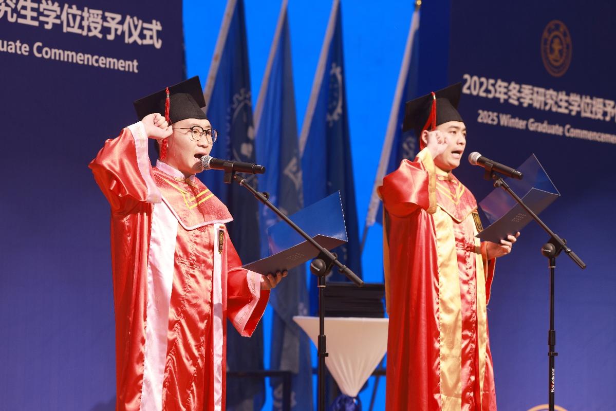 西安交大“优秀研究生标兵”“优秀研究生”获得者、材料学院博士毕业生张崇乐,西安交大“优秀研究生标兵”“优秀研究生”获得者、公管学院博士毕业生段永彪带领全体毕业生宣誓。“谨遵师长教诲,铭记交大校训,弘扬西迁精神,矢志爱国奋斗。砥砺前行,开拓创新,坚守理想,书写华章。百年峥嵘岁月,交大青年,守初心之星火。今朝风华正茂,交大青年,铸明日之辉煌。”