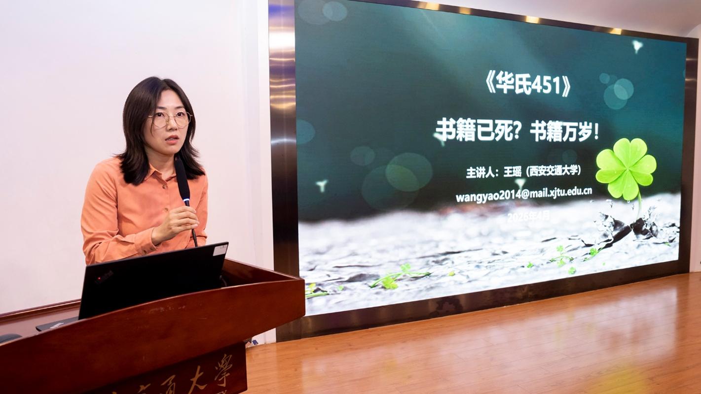 人文学院教授、科幻作家王瑶带来主题为“《华氏451》:书籍已死?书籍万岁”的讲座。她结合小说背景与情节,反思媒介技术对阅读的冲击,解读“电视墙”“海贝收音机”对当下生活的深刻预见。她阐释了“书人”以记忆传承书籍的内核,指出阅读不仅是获取知识,更是找回快乐、重建深度交流的方式,呼吁大家坚守阅读、保持思考,以书香抵御浮躁、守护文明火种。