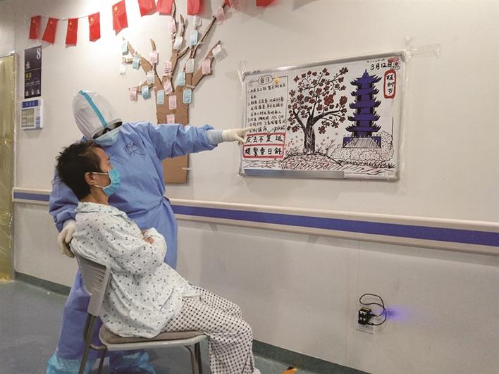 西安交大一附院援鄂青年先锋队员樊丽娜陪伴患者欣赏援鄂队友手绘的漫画,宽慰患者心情,坚定康复的信念