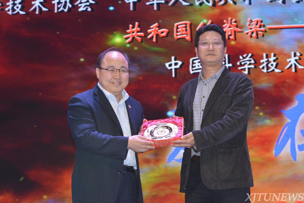 中国科技大学党委副书记蒋一介绍了《爱在天际》的创作情况,宫辉副书记与其代表双方交换纪念标识。