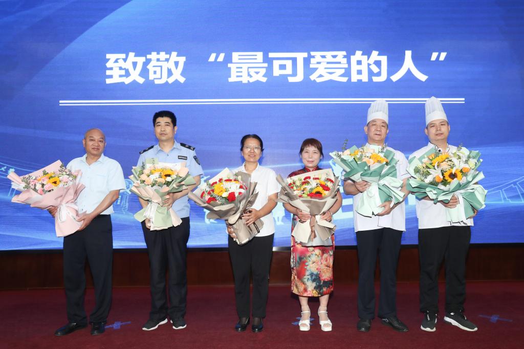 学院特邀学校后勤保障工作人员——葆力物业兴庆校区仲英楼主管陈天才、保卫处兴庆校区西南门班长蔡耕、本科生东20舍宿管李院利、研究生西9舍宿管张颖、康桥苑副经理万锋,康桥苑学3、学4窗口工作人员丁亚洲至现场,作为本次学位授予仪式的特别环节。毕业生代表们逐一上台为其献花,致敬这些承载着青春回忆的“最可爱”“最可亲”的人,感恩他们日复一日的陪伴,守护着同学们安全、快乐、无忧地成长。