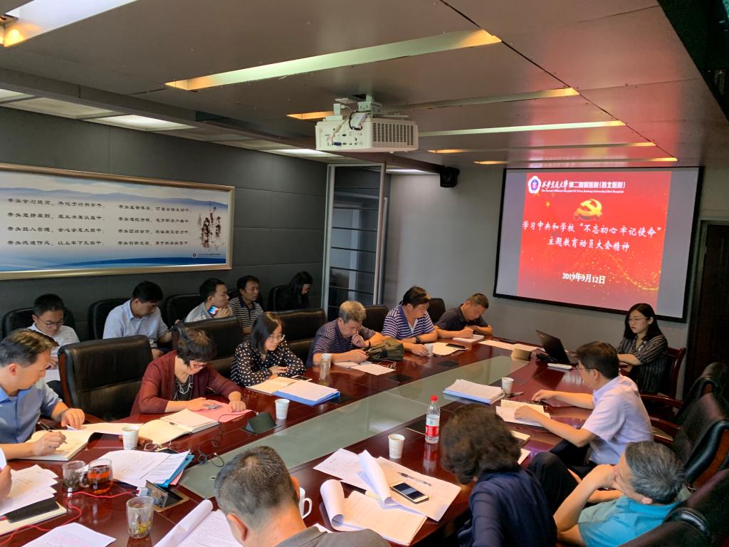 巩守平书记在会上首先传达了中共中央政治局常委、中央书记处书记王沪宁在“不忘初心、牢记使命”主题教育第一批总结暨第二批部署会议上的讲话精神以及校党委书记张迈曾,中央第一指导组副组长、工信部人事教育司副司长闫为革在学校“不忘初心牢记使命”主题教育动员大会上的讲话精神。巩书记在强调“不忘初心、牢记使命”主题教育重大意义的同时,要求全体参会人员要认真学习、全面贯彻,切实把思想和行动统一到党中央部署和学校要求上来。他指出,做好主题教育,必须深入学习习近平新时代中国特色社会主义思想,增强“四个意识”,坚定“四个自信”,做到“两个维护”,全面把握守初心、担使命,找差距、抓落实的总要求,必须紧密结合医院中心工作,坚持抓思想认识到位、抓检视问题到位、抓整改落实到位、抓组织领导到位,最终达到理论学习有收获、思想政治受洗礼、干事创业敢担当、为民服务解难题、清正廉洁作表率的目标。