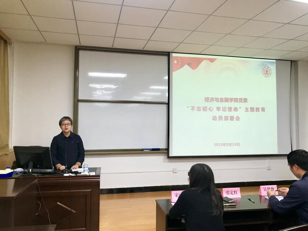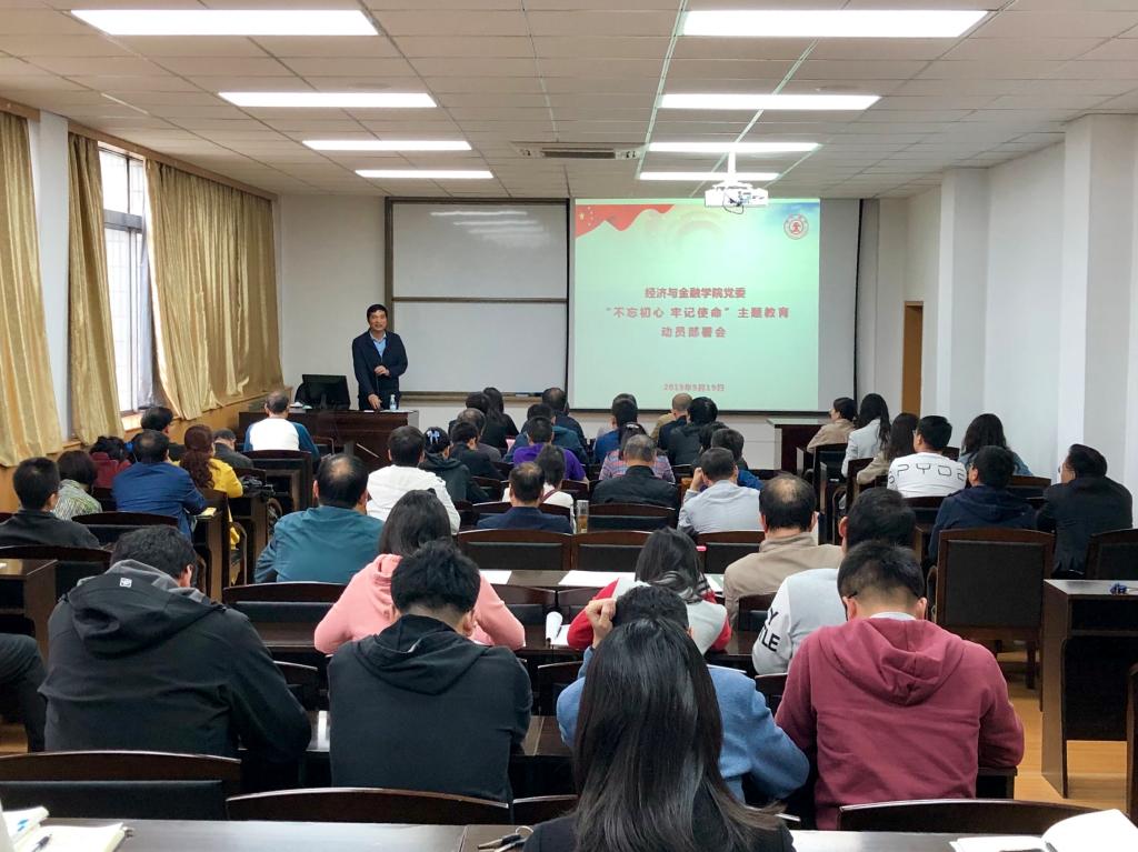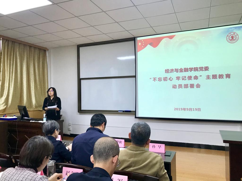 9月19日下午,经济与金融学院党委在财经主楼802报告厅召开“不忘初心、牢记使命”主题教育动员部署会。学院领导班子、教工党员、学生党员代表共计70余人参加会议。主题教育第十指导组联系常委张定红、成员吴孟秋、罗娴出席会议。会议由经金学院党委书记宋丽颖主持。