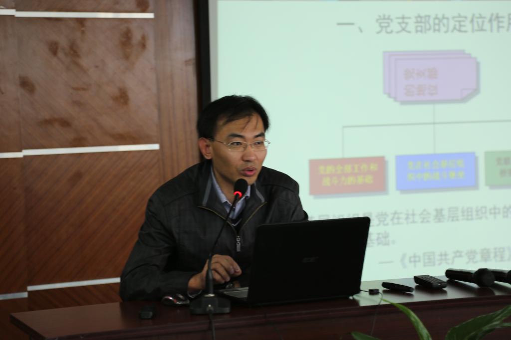 校组织部杨清宇副部长作了题为《从严从实 开拓创新 将党支部建成推动事业发展的坚强战斗堡垒》的重要报告。报告从党支部的定位作用、职责任务、重点工作、工作思路及工作实践五个方面为大家进行了详细阐述。提出基层党支部要在深入领会“三严三实”内涵要求和学校第十二次党代会报告精神的基础上,结合企业经营的实际情况,调动广大党员群众的积极性,发挥支部的战斗堡垒作用,促进公司各方面的发展。