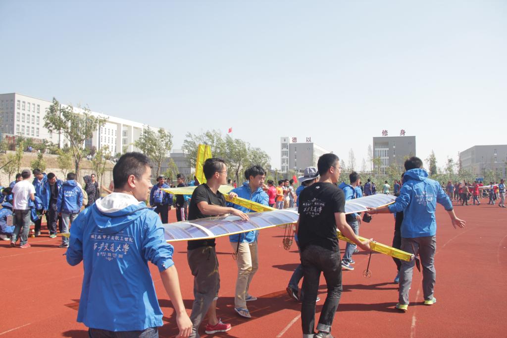 “太阳能飞机”项目要求飞行器不携带储能设备,单纯依靠多晶硅太阳能电池板为动力源,通过滑跑方式起飞,以载重物质量以及留空时间多者为胜。西安交大学子设计的太阳能飞机采用高升阻比、大展弦比的设计思路,机翼翼展4.6m,整机空载重量仅重2.9kg,最大载荷重量2.4kg,在飞控系统中添加了自行设计的太阳能最大功率跟踪模块,一举夺得了本届大赛创新评比一等奖和最佳飞行奖。