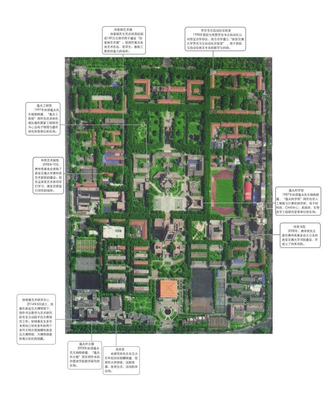 近六十年来,社会各界爱心人士一直关心着西安交大的发展,他们慷慨出资,在校园里建起数栋用于教学、科研及举办学生活动的建筑。其中,不乏曾宪梓、邵逸夫、唐仲英、田家炳等著名企业家和慈善家,以他们的名字命名校园建筑,不仅为一代代师生留下读书学习的好场所,更为这座校园留下了爱、责任与奉献的精神力量。