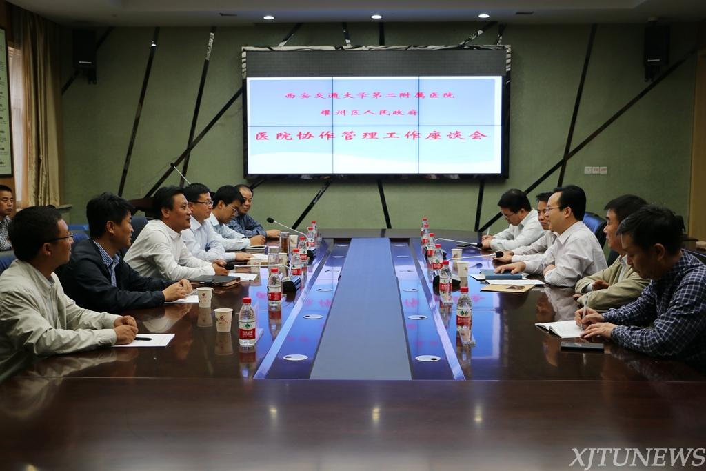 9月30日下午,铜川市耀州区委书记杨宏伟、区长张大军等一行十余人来到交大二附院,就医院与耀州区政府合作对新建的耀州区人民医院进行委托协作管理工作进行座谈协商。交大二附院院长贺西京教授出席并主持会议,副院长李宗芳、李文典、高亚,副书记巩守平及总会计师谢丹出席座谈会议,院办、医务部、护理部、感染办、后勤服务部、对外服务部等相关职能部门负责人参加会议。