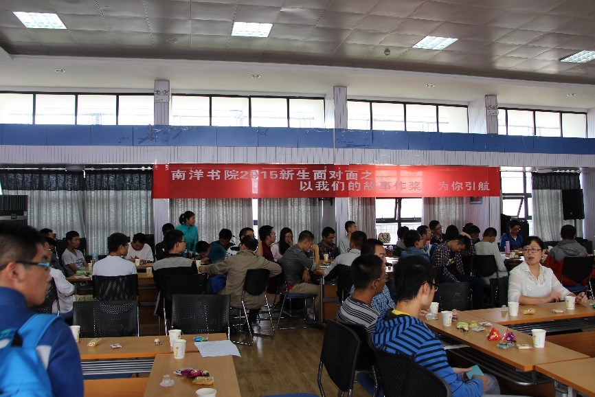 智慧南洋,齐聚一堂,阳光明媚的10月7日下午,南洋书院举办了“以我们的故事作浆,为你引航”为主题的2015级新生面对面座谈会,旨在通过分享大三、大四优秀学长的故事和经历,引导新生更好地适应大学的学习和生活。南洋书院院务主任刘茹、电信学院副院长罗新民教授、电气学院电力电子教学实验中心主任刘晔教授、南洋书院院务主任助理纪婷、大一辅导员岳娅萍、陈波,优秀学长代表和2015级部分新生参加本次座谈会。