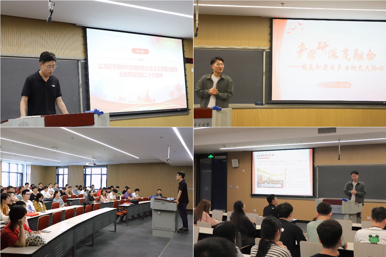 校宣讲团成员、学院兼职辅导员张宇航以“产学研深度融合——发展新质生产力的交大路径”为题,从“是什么、为什么、怎么做”三个篇章切入,阐释了新质生产力的基本内涵、核心标志、特点、关键、本质,并结合学校“6352”工程、“1121”产学研深度融合模式的中心工作,讲述了交大在发展新质生产力方面的探索和成果。薛同宣讲授“以严守党纪正心正身 以锤炼党性律己律行”专题党课,带领大家全面学习了《中国共产党纪律处分条例》,并号召广大青年以此次党纪学习教育为契机,磨砺党性、锤炼品格,“认真学《条例》、深刻悟原理、实干建新功”,为党和国家事业发展作出新的更大贡献。