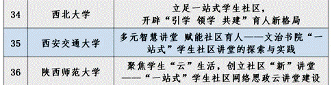 本次全国高校“一站式”学生社区风采展示活动按照“社区讲堂、书香社区、社区团队、工作案例”等4个版块分类展示高校“一站式”学生社区建设风采。西安交通大学凝练总结“一站式”学生社区建设经验、挖掘亮点特色,由学工部牵头撰写的《弘扬西迁精神,创新社区党建构筑学生全面成长成才综合体》《多元智慧讲堂赋能社区育人——文治书院“一站式”学生社区讲堂的探索与实践》分别获评“工作案例”“社区讲堂”两个评选单元优秀成果。西安交大获奖案例将被纳入全国高校思想政治工作网资源库,并在“一站式”学生社区综合管理模式建设工作云平台及高校思政网微信公众号进行集中展示。