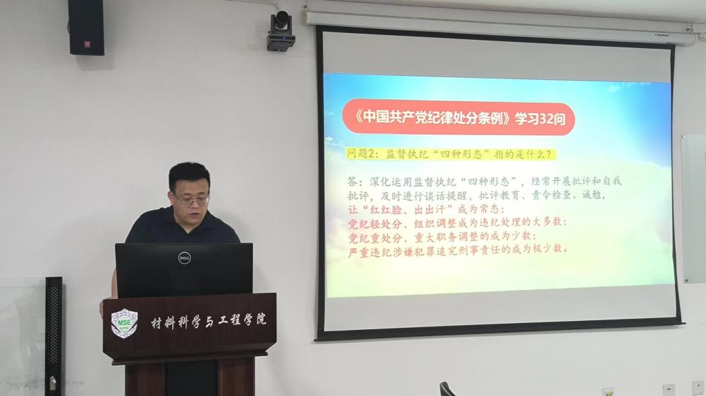 与会人员依次分享了学习心得和感受。材料学院院长丁向东强调,党的纪律是管党治党的关键,广大党员干部要深刻认识开展党纪学习教育的重大意义,打好“学纪”基础,做到“知纪”前提,守好“明纪”根本,抓住“守纪”关键,始终做到忠诚干净担当。材料学院党委副书记魏炜表示,此次党纪学习教育对于加强党的纪律建设、推动全面从严治党向纵深发展具有重大意义,党员干部要紧抓“学”和“悟”,认真学纪,把握《条例》的具体内容和鲜明特点,谨防党纪学习教育“浮于表面”;笃行守纪,要学懂弄通,做到知行合一。