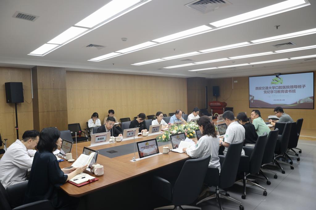 6月12日,口腔医院举办第六期领导班子党纪学习教育读书班,集中学习修订后的《中国共产党纪律处分条例》(以下简称《条例》)分则中部分内容,进一步推动党纪学习教育走深走实。医院党委书记滕晶主持读书班并讲话,院领导班子成员参加会议。
