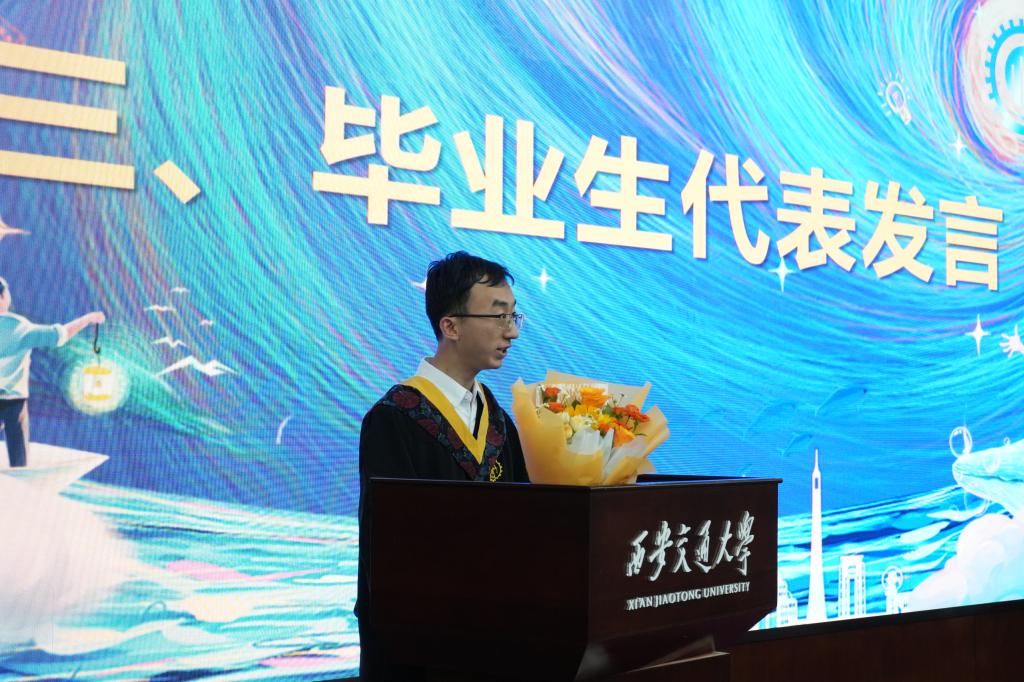 机械004班学生朱一辰作为毕业生代表发言。他回顾了走进机械学院的喜悦激动,分享了在工程制图、机械设计基础等专业课程中的难忘经历和在生产实习、企业实践的宝贵收获。他表示,机械学院塑造了同学们的品格,淬炼了专业能力,将永远牢记学院培养、老师教诲,永远以身为机械人、交大人而自豪,永远捍卫机械荣誉和交大荣誉。