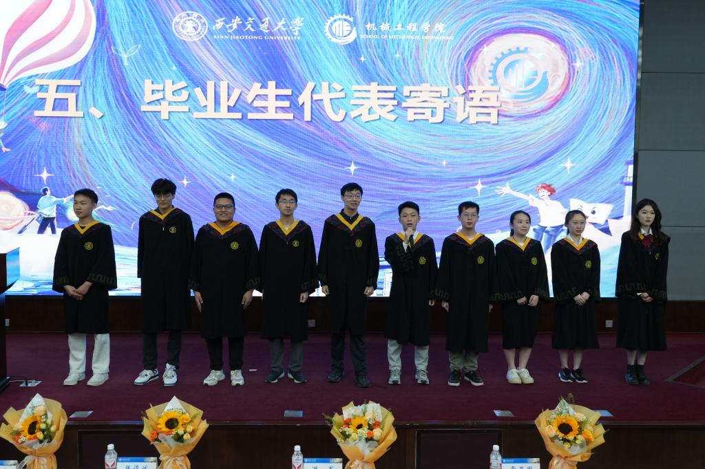 本校读研的3D打印001班马铎、机械003班杨帅、机械001班包翰盟,前往上海交通大学读研的车辆001班张强博,到英国帝国理工学院深造学习的机械002班邱宣筼,作为选调生奔赴河北邯郸的食品测控001班吕义博,前往中核辽宁核电有限公司工作的工设001班孙欣悦,选择到上海正泰智能科技有限公司施展才华的机械004班朱心语,被录取到北京航空航天大学读研的机械006班杨陌涵,到北京大学读研的智造钱001班孙承睿等10名前往各知名学府深造和祖国大地建功立业的毕业生代表为教师代表献花并分享了毕业感悟和对母校母院的祝福。