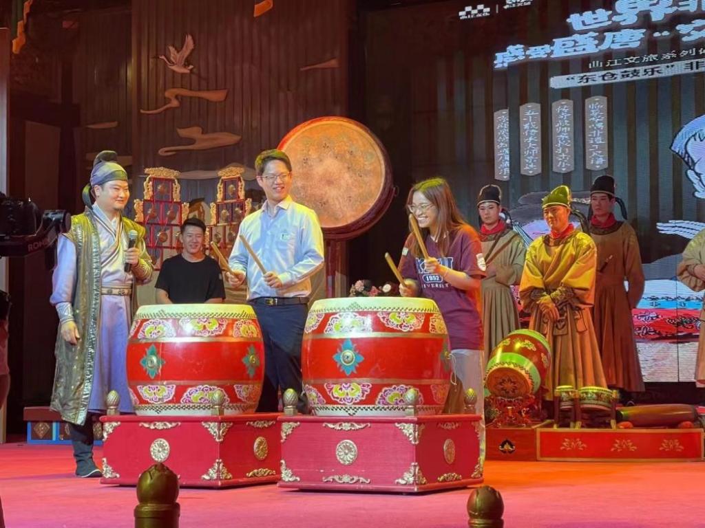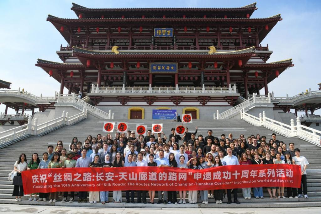 活动现场,西安东仓鼓乐社非遗艺术家与近200人海内外学生带来精彩演出,共同庆祝“丝绸之路:长安—天山廊道的路网”申遗成功十周年。