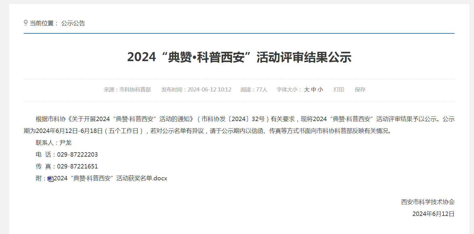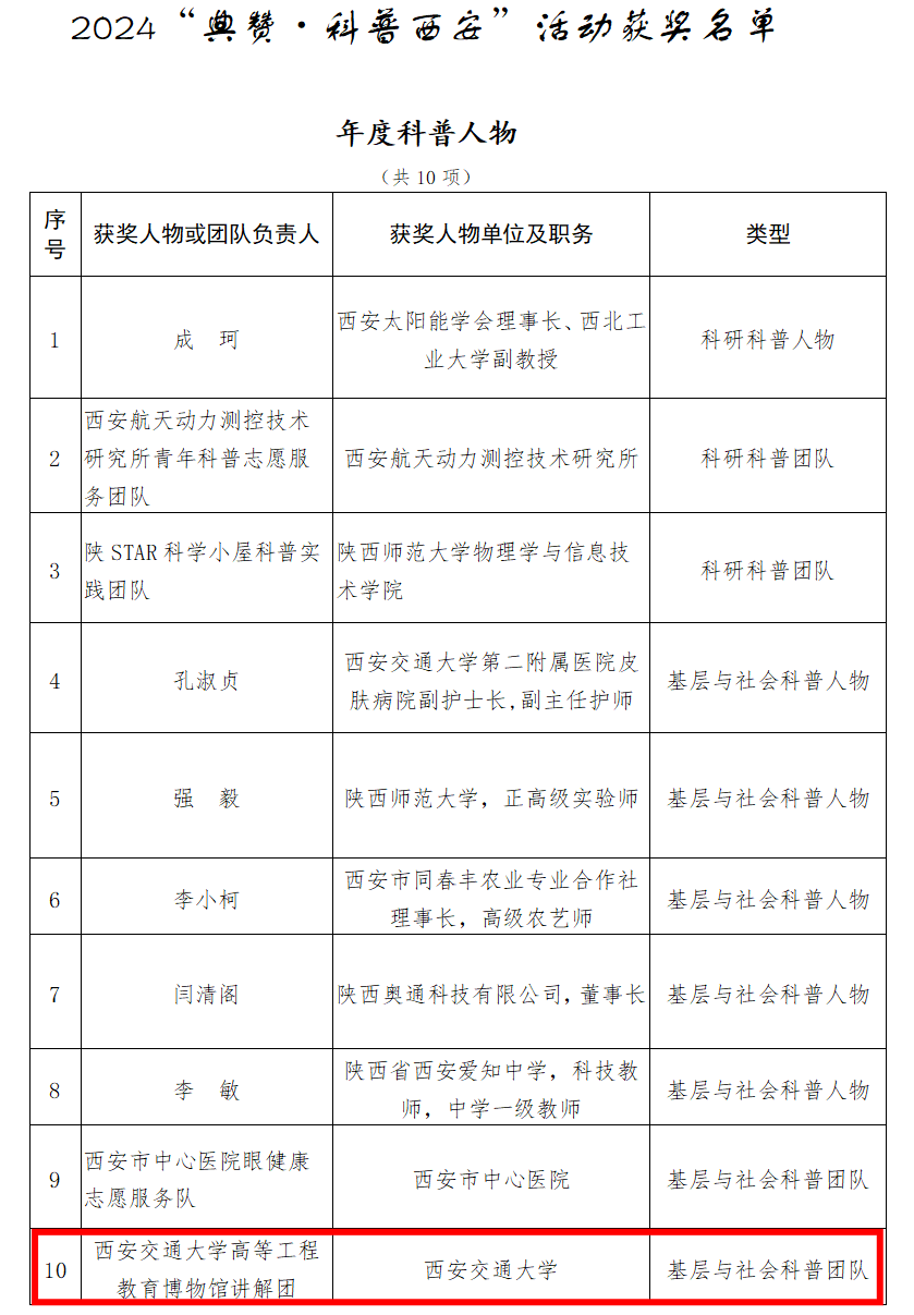 近日,陕西省西安市科学技术协会2024“典赞•科普西安”活动获奖名单公示,西安交大高等工程教育博物馆讲解团获评“基层与社会科普团队”年度奖项。“典赞•科普西安活动”共有10位人物及团队获得年度科普人物,其中有2个高校科普团队入选。