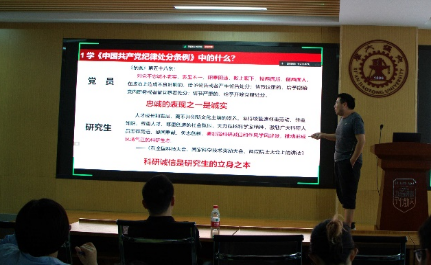 博士生力学第三党支部苏冰洁同志重点领学了条例前三章共27条内容,深入讲解“网络舆情”有关话题,并针对最新的网络案例进行讨论,从“树立社会责任”“树立文明上网意识”“树立网络安全意识”“树立自我保护意识”四点内容对党员行为进行了规范。