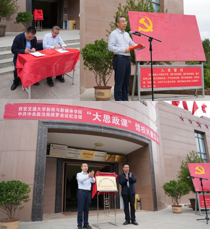 为深化党建合作,新媒体学院党委与榜罗镇会议纪念馆举行合作签约仪式。马忠与陈鹏鸣共同为教育实践基地签约、揭牌,陈鹏鸣受聘为课程思政校外合作教师。新闻系党支部书记李巨星主持仪式。