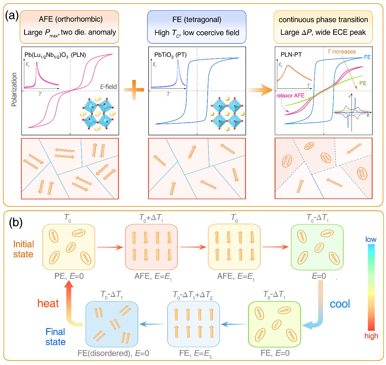 图1. Pb(Lu1/2Nb1/2)O3-xPbTiO3陶瓷体系的设计思路与电卡制冷循环示意图