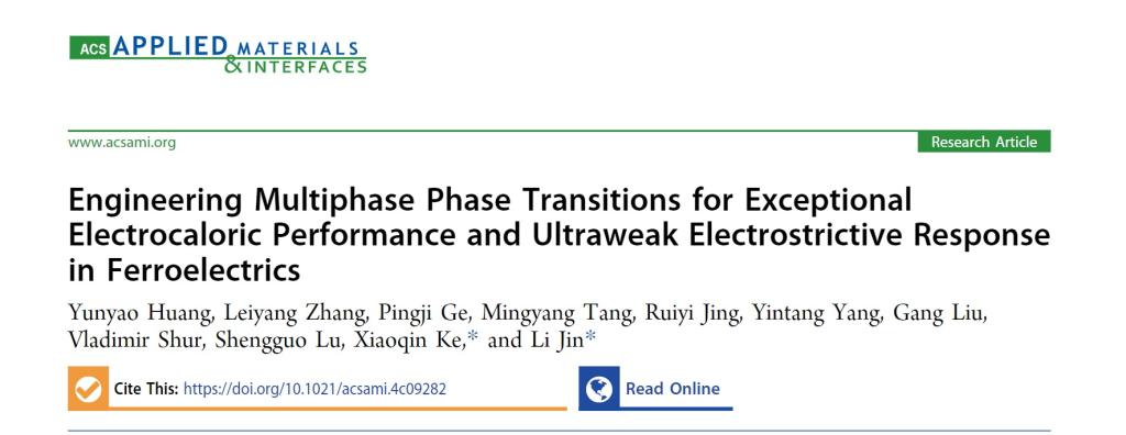 以《多相变设计实现铁电材料中的卓越电卡性能和超弱电致伸缩响应》(Engineering multiphase phase transitions for exceptional electrocaloric performance and ultraweak electrostrictive response in ferroelectrics)为题发表在《ACS Applied Materials & Interfaces》上。