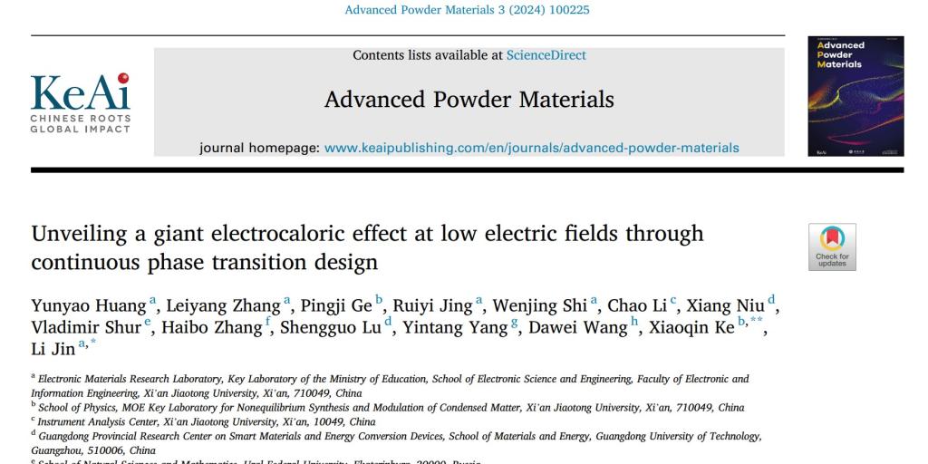 该研究工作近日以《通过连续相变设计揭示低电场下的超高电卡效应》(Unveiling a giant electrocaloric effect at low electric fields through continuous phase transition design)为题发表于国际著名期刊《Advanced Powder Materials》上。