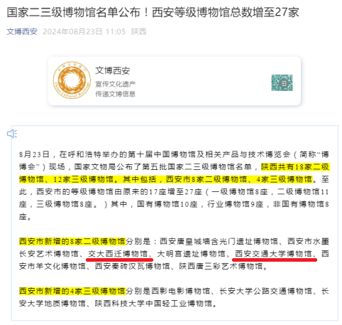 8月23日,在呼和浩特举办的第十届中国博物馆及相关产品与技术博览会(简称“博博会”)现场,国家文物局公布了第五批国家二三级博物馆名单,陕西共有18家二级博物馆、12家三级博物馆。交大西迁博物馆、西安交通大学博物馆获批国家二级博物馆。
