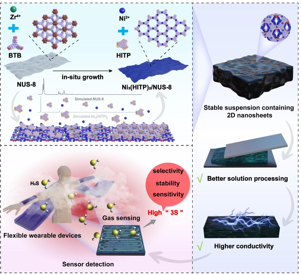Ni3(HITP)2/NUS-8合成策略示意图及其在多维传感中的应用