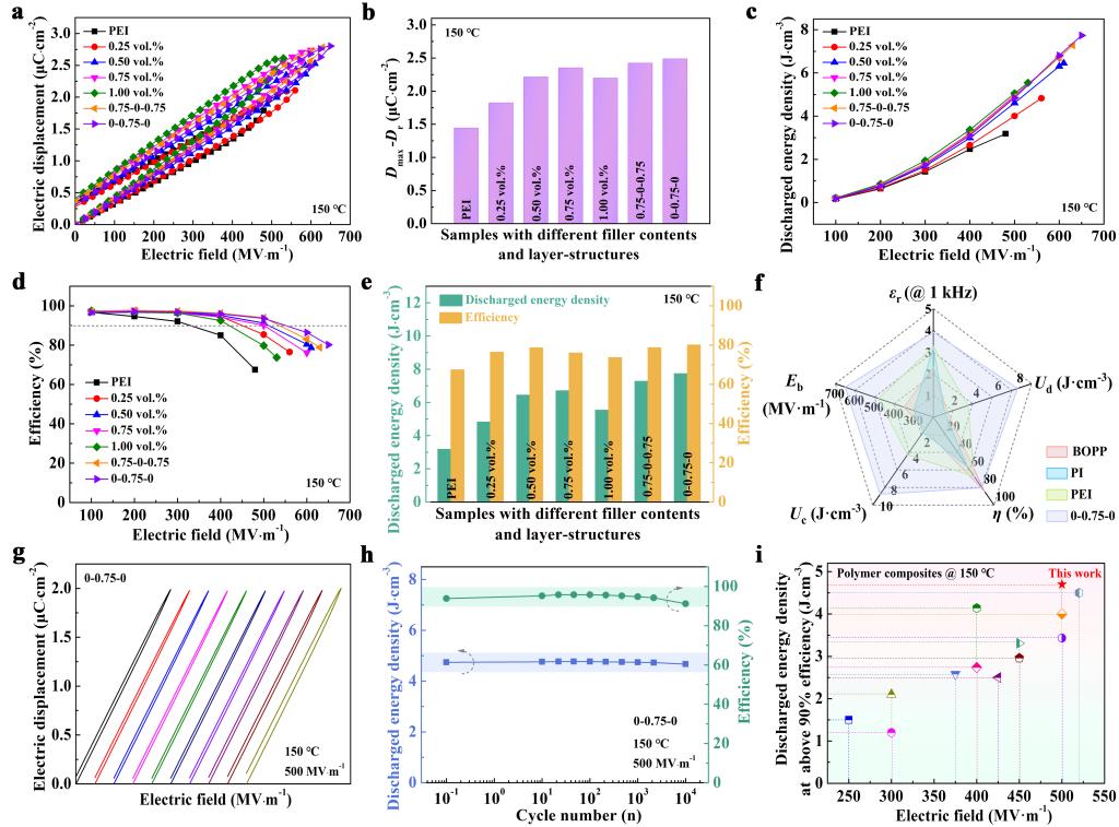 针对这一问题,西安交通大学电信学部电子科学与工程学院周迪教授团队提出了一种叠层结构设计方法,将具有稳定准线性电滞回线和较高介电常数的无机填料颗粒与具有高击穿强度的PEI薄膜相结合。通过固相反应法制备了具有高介电常数和低损耗的0.55Bi0.5(Na0.84K0.16)0.5TiO3-0.45(Bi0.1Sr0.85)TiO3(BNKT-BST)致密陶瓷,同时采用流延和热压工艺制备不同结构BNKT-BST/PEI纳米复合材料(图1)。引入BNKT-BST无机填料显著提高了PEI基复合材料的介电常数、击穿强度和力学性能,同时降低了损耗和漏电流密度,从而获得了优异的能量存储性能。更重要的是,在150 ℃和650 MV m-1条件下,三层结构的0-0.75-0纳米复合材料实现了最高放电能量密度为7.7 J cm⁻³,充放电效率为80.2 %(图2)。同时,该研究阐明了电极尺寸对聚合物基复合材料介电常数和能量密度的影响,为如何规范电容器的储能密度测量提供了一个可靠的标准,这在相当长的一段时间内被许多研究者所忽视。对于聚合物电介质及其复合材料,ɛr一般小于10,电极尺寸将严重影响其电容和储能性能(电极小,回路寄生电容和边缘效应贡献大,电容虚高),亟需确立介电性能实验室测试标准,以免误用的数据进一步积累而导致的负面影响。例如,由于不同器件的寄生电容不完全相同,应尽量增大电极面积减小寄生电容对测试的影响;或建立统一的测试标准(如用商用的PTFE、BOPP等进行标定),以减少电容虚大和储能密度虚高的现象。