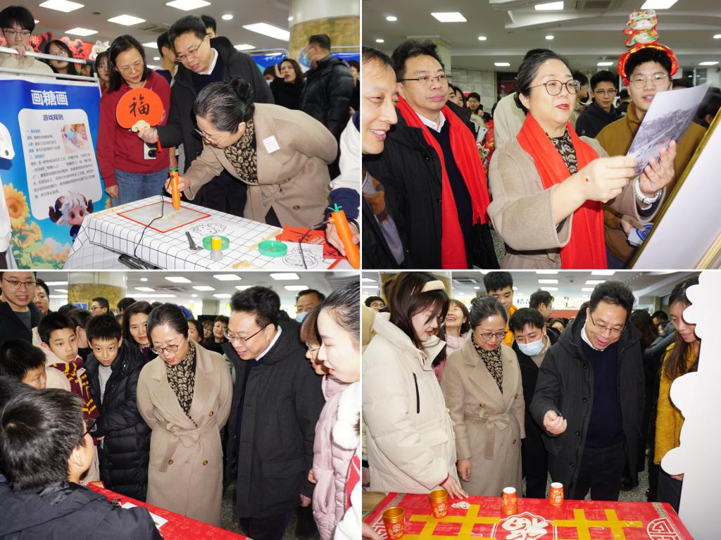 游园会现场洋溢着节日的喜悦,校领导参观了各个展区,欣赏了丰富多彩的文艺表演,并与师生们并肩游戏、亲密互动,共享欢乐时光。他们频频点赞,热情喝彩,还为同学们送上了温馨的新年祝福,共迎佳节。