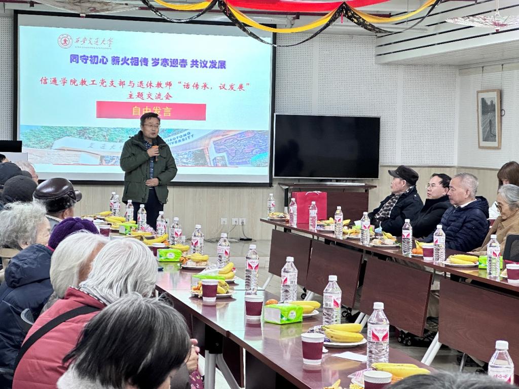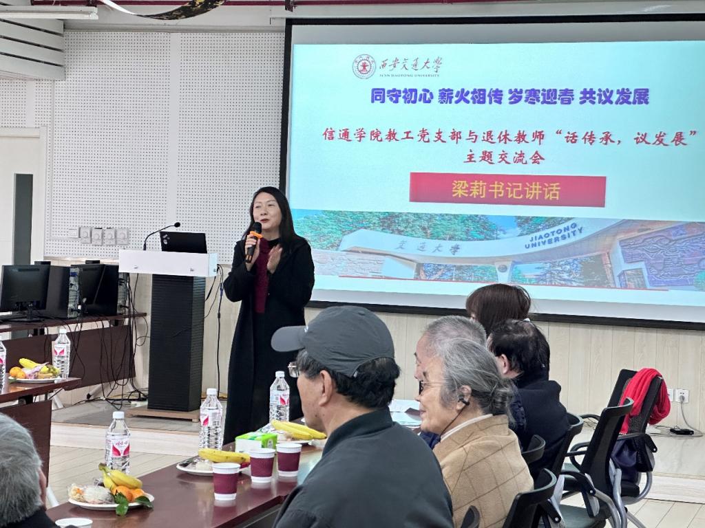 2024年12月27日下午,信息与通信工程学院在交大二村教工之家多功能厅举办教工党支部与退休教师“话传承,议发展”主题交流会。电信学部党委书记梁莉、原副主任罗新民、办公室主任黄文,信通学院党政领导、24位退休教师以及教工支部党员代表参加本次活动,会议由学院党总支副书记张国梅主持。