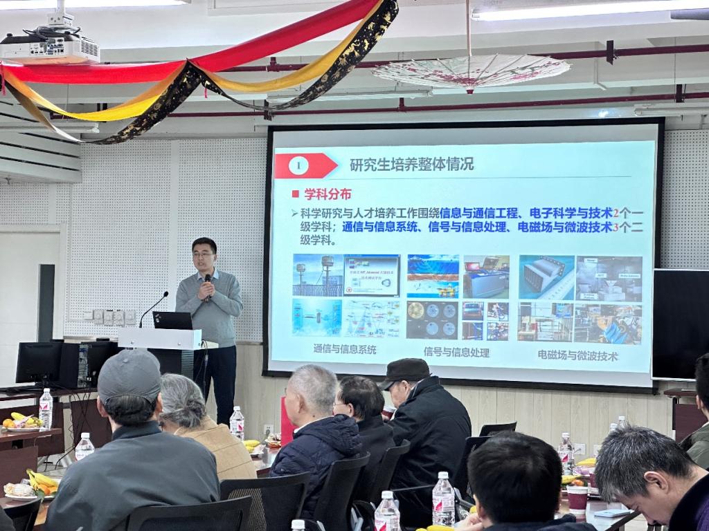 信通学院院长王文杰给退休老师们汇报了学院2024年度师资力量增量及新布局的科研方向,分享了学院对未来校区规划方面的思路。