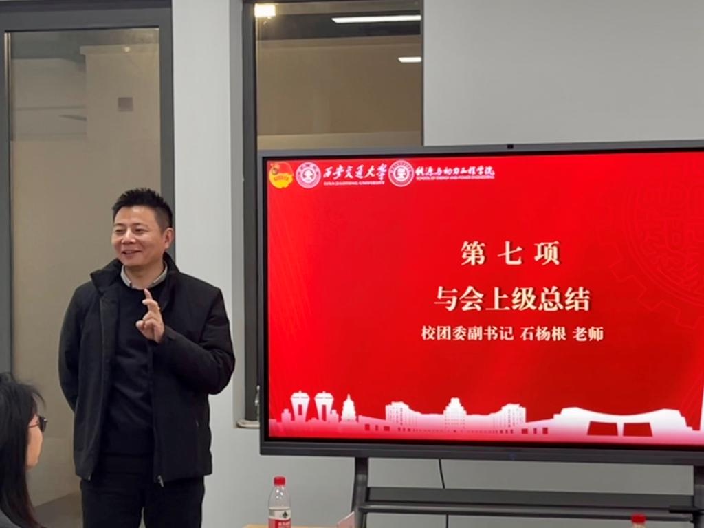 石杨根在总结讲话中代表校团委对能动学院团委及硕4061团支部的工作成效给予了充分肯定,对团支部成员积极投身科研学业、参与各项活动表示认可。他强调专题组织生活会作为“三会两制一课”关键一环,在思想政治引领和团组织建设中具有重要作用,肯定本次会议对基层团建的示范价值。同时,他也给同学们提出殷切期望,希望同学们在未来个人的成长发展中要有目标、有信心,也要做到勤学、笃行,能够将个人成长融入国家发展需求,成为德智体美劳全面发展的社会主义合格建设者和可靠接班人。