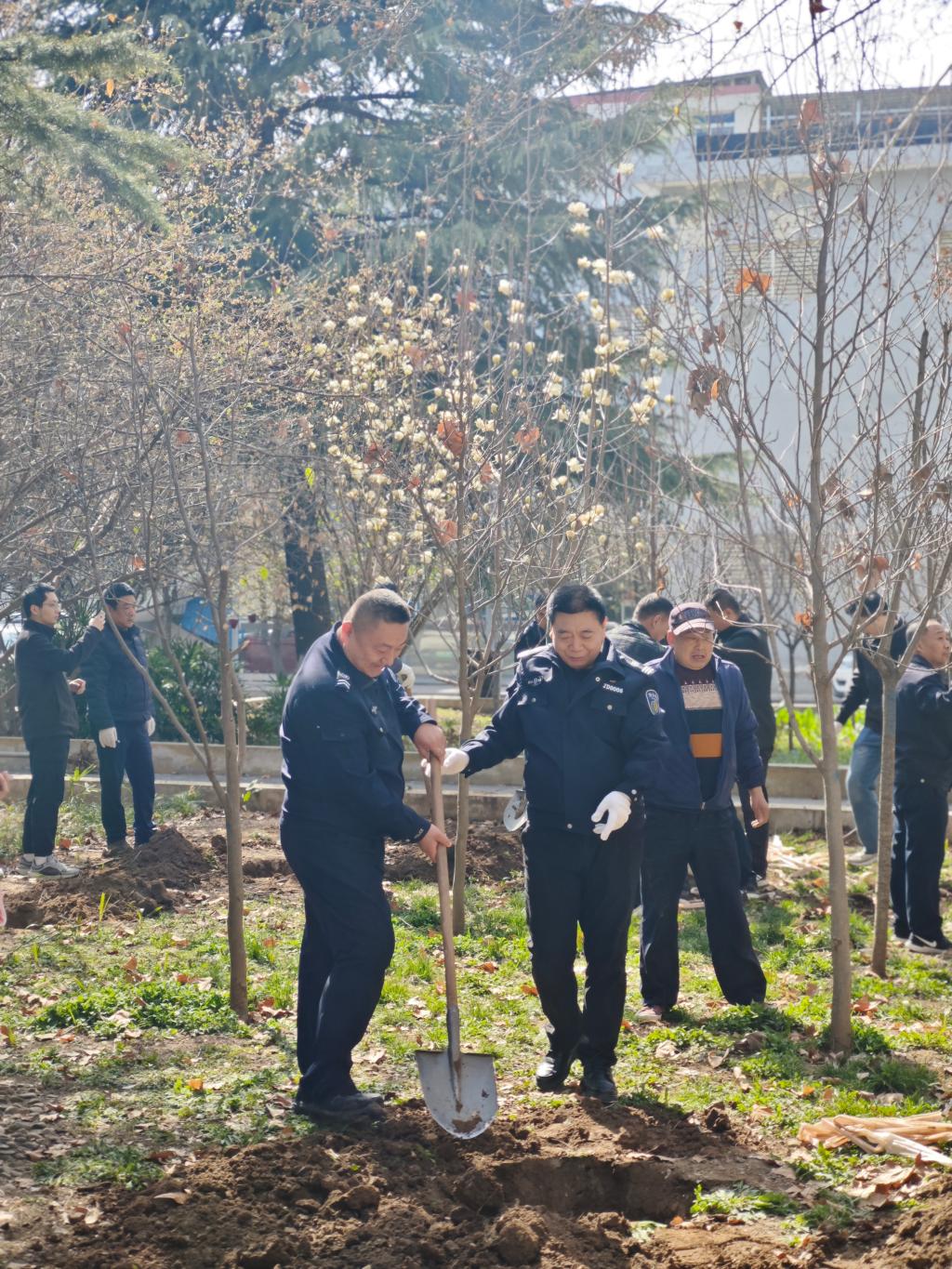 活动现场,同志们热情高涨,挥锹铲土、扶苗填坑、浇水施肥,各个环节井然有序。经过共同努力,广玉兰树苗顺利栽种,为校园增添了一抹新绿。