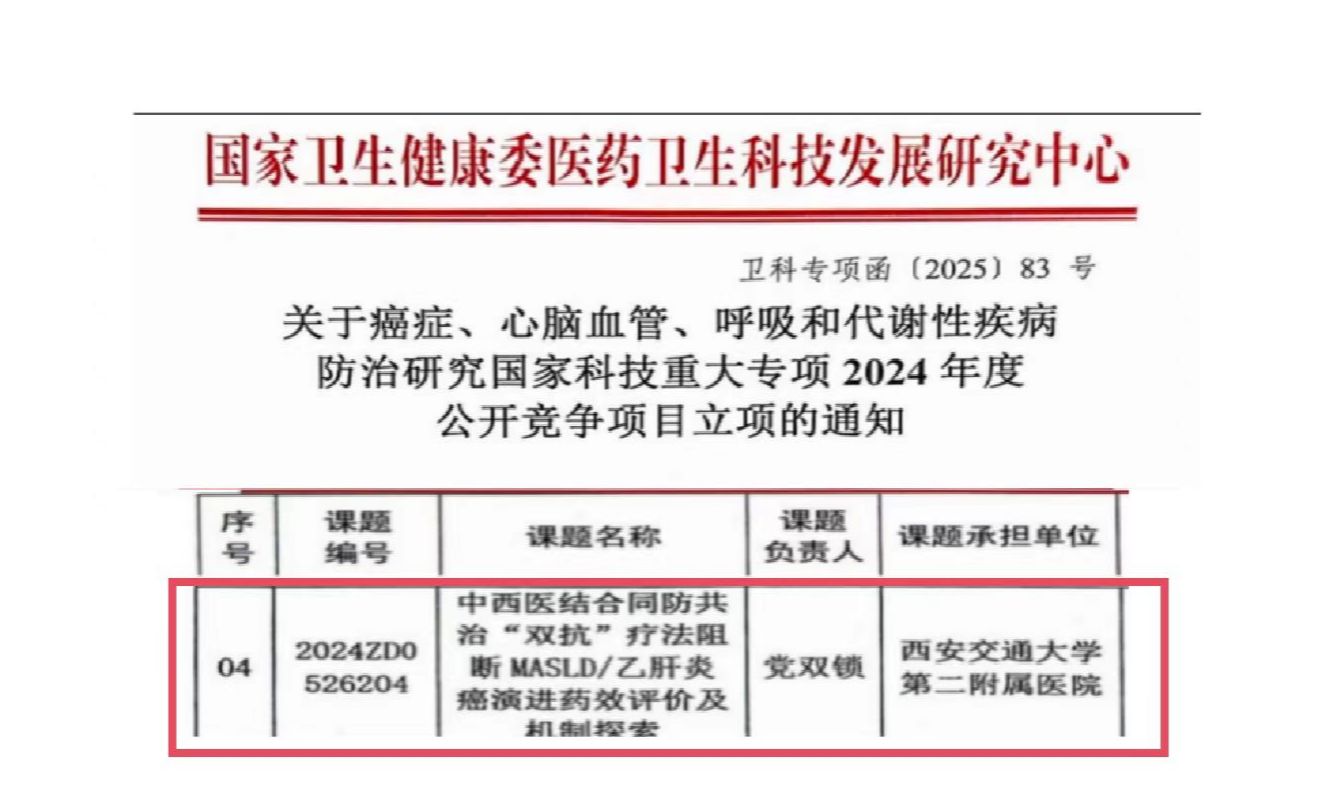 近日,国家卫生健康委医药卫生科技发展研究中心发布了“癌症、心脑血管、呼吸和代谢性疾病防治研究国家科技重大专项”2024年度定向项目立项通知,西安交通大学第二附属医院感染科党双锁教授团队牵头申报的“中西医结合“双抗”疗法阻断MASLD/乙型肝炎癌演进药效评价及机制探索”项目获批立项,该课题隶属于“原发性肝癌中西医结合预防体系创建与临床评价研究”项目的子课题。此项目的获批标志着二附院在肝癌防治领域迈出了坚实的一步,充分彰显了感染科雄厚的科研实力和中西医结合研究优势。