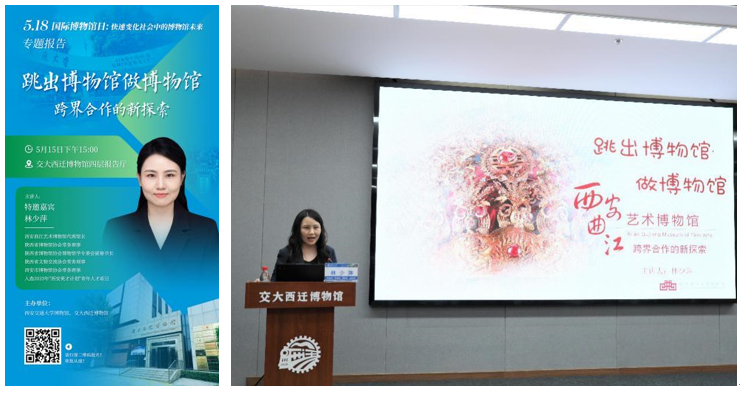 5月15日,特邀西安曲江艺术博物馆代理馆长林少萍来校作题为《跳出博物馆做博物馆——西安曲江艺术博物馆跨界合作的新探索》专题报告。报告分享了曲江艺术博物馆与各界合作的典型案例,深入剖析了跳出博物馆、探索跨界合作新路径对博物馆创新发展的重要作用。