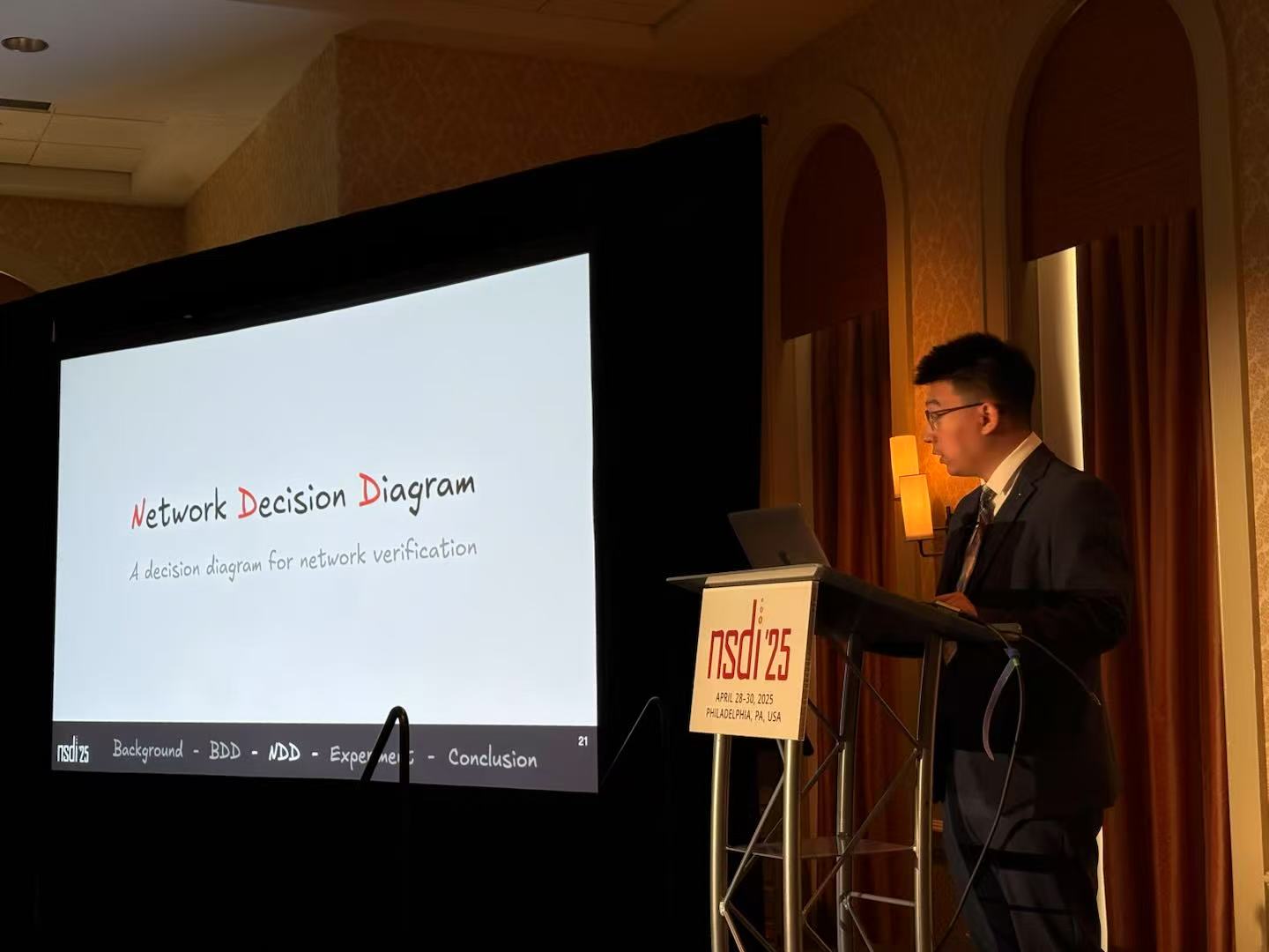 近日,第22届USENIX网络系统设计与实现大会(22nd USENIX Symposium on Networked Systems Design and Implementation)在美国费城召开。西安交通大学计算机学院先进网络系统团队获得USENIX NSDI 2025大会唯一杰出论文奖(Outstanding Paper Award)。论文针对网络多域匹配决策的特点,对经典的二元决策图(Binary Decision Diagram)进行重新设计,提出了一种新的名为网络决策图(Network Decision Diagram)的数据结构,将网络验证的时间和空间效率提升了若干数量级。论文第一作者为本校计算机学院硕士生李泽春,通信作者为计算机学院张鹏教授。