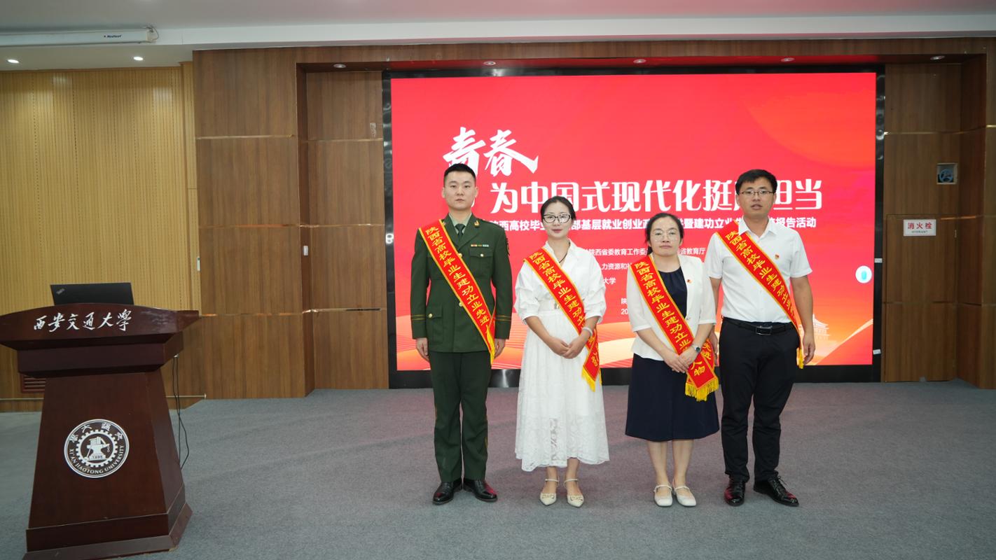 报告会上,西安交通大学2015届硕士毕业生、贵州省铜仁市德江县潮砥镇党委书记陈吴,西北工业大学2009届本科毕业生、江西省瓜大年华文化传媒有限公司创始人龙婕,陕西学前师范学院2012届毕业生、陕西省榆林市第二十四幼儿园教师韩婵,西安外事学院2019届毕业生、西安柒宝餐饮管理有限公司法人王高民等四人分享了他们建功立业的先进事迹。