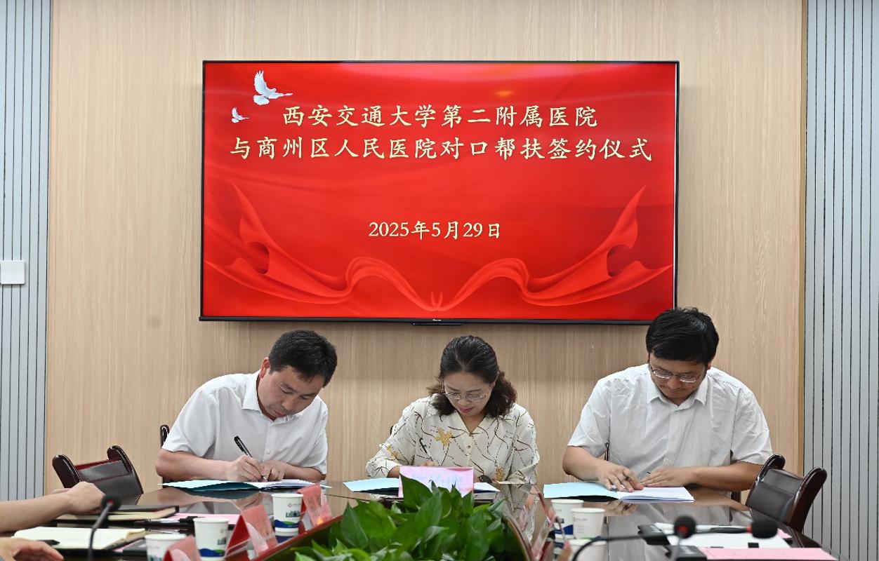 为贯彻落实西安交通大学党委关于乡村振兴战略相关要求,进一步推动二附院与商州区合作,近日,西安交大二附院副院长戴一带领前往商洛市商州区人民医院签署对口支援协议书并捐赠救护车。商州区人民政府副区长王莉,区卫健局党组书记、局长王丹彤,区人民医院领导班子及相关科室负责人出席仪式。签约仪式由商州区卫健局党组书记、局长王丹彤主持。签约仪式后,双方围绕医疗人才飞地建设等,进行座谈。