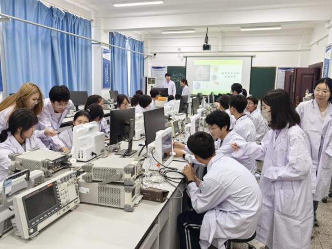 在讲解和分享过程中,同学们认真聆听、热情高涨,积极参与互动环节,针对监护仪的原理细节、荧光微生物绘画技巧等专业知识踊跃提问。在场师生为中学生们耐心解答,现场交流氛围浓烈,同学们在思维的碰撞中加深了对生命科学的理解,激发了探索生命奥秘的热情,为后续的实验操作奠定了良好的基础。