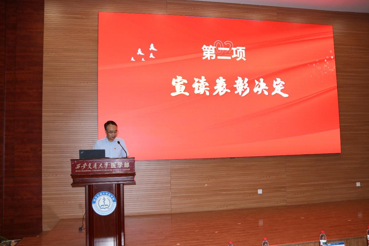为表彰先进、凝聚力量,6月25日下午,公共卫生学院在雁塔校区医学部国际会议厅举行庆祝中国共产党成立104周年暨“七一”表彰大会。本次活动由公共卫生学院党委副书记岳甜主持,医学部常务副主任雷利利、公共卫生学院全体师生党员、党员发展对象、承璞话剧社成员等参加活动。