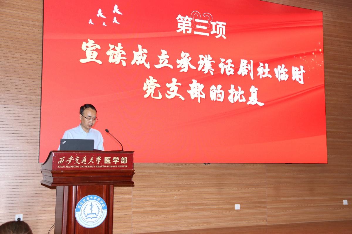 大会举行承璞话剧社临时党支部成立仪式。雷利利宣读《关于同意成立公共卫生学院承璞话剧社临时党支部的批复》,任命陆年森担任党支部书记,巩千汇担任支部副书记,葛晨曙、方柳担任支部委员。临时党支部成员在岳甜带领下重温入党誓词。该支部旨在“把党旗牢牢插在文艺创作第一线”,将殷培璞教授的精神从舞台演绎转化为实践行动,探索党建与美育、思政教育深度融合的新路径,教育广大医学生传承红色基因,弘扬崇高职业精神。大会进行《殷培璞》话剧展演,演员们生动还原了殷培璞教授扎根基层、服务百姓的感人事迹,师生在艺术呈现中接受了一次深刻的党性教育与职业精神洗礼。