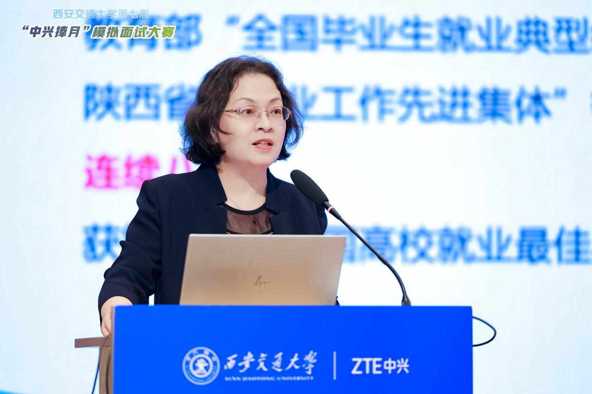 郑旭红在开幕式上作2026届就业动员暨《校企携手,共促高质量就业》主题分享。她介绍了学校为促进学生树立正确就业观、实现高质量就业所采取的多项重要举措,现场动员2026届毕业生按照“求职月历”把握黄金求职阶段,积极参与学校各项就创业指导活动。她还回顾了西安交大与中兴通讯等行业龙头企业校企合作就业育人的历程,未来将持续推进产学研模式融入就业全链条。最后,她预祝第七届中兴捧月模拟面试大赛取得圆满成功。