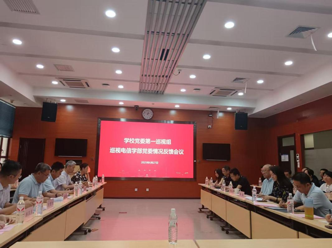 6月27日,电信学部召开校党委第一巡视组巡视反馈会。党委常委、副校长洪军出席会议并讲话,巡视组组长梁得亮、巡视办主任杨小渭、组织部副部长饶昱久、纪检监察机构综合业务室主任李倩,电信学部、学院领导班子成员、党委委员、教工党支部书记及教工代表参加反馈会,中国科学院院士、电信学部主任管晓宏主持会议。