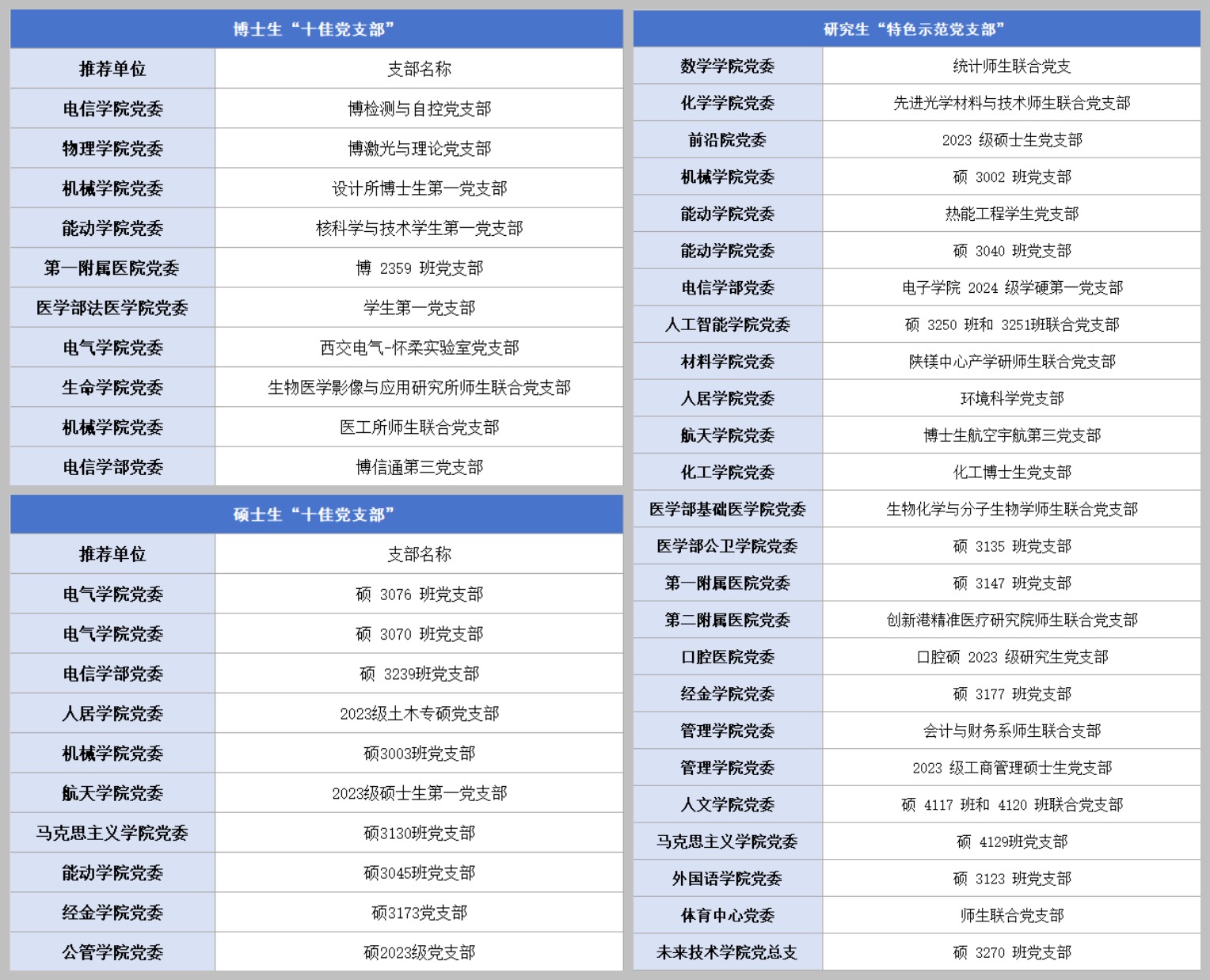 电信学部党委博检测与自控党支部坚持“四个面向”,积极践行科技兴国的使命担当,支部党员自2021年起至今连续四年获得“优秀研究生标兵”荣誉。机械学院党委设计所博士生第一党支部坚持党建促科研、科研强担当,致力于设计科学理论研究和装备制造,研究成果应用于国家重大装备和相关企业。能动学院党委核科学与技术学生第一党支部不断熔铸“不忘初心、牢记使命、艰苦奋斗、砥砺前行”的团队文化,聚焦核能技术领域科研创新,取得丰硕成果,支部多名成员多次获国家奖学金。第一附属医院党委博2359班党支部始终将助力健康中国建设、国家医学中心建设作为奋进方向,全体成员弘扬西迁精神,胸怀“国之大者”,聚焦科学问题,解决临床难题,脚踏实地,开拓创新,践行“健康所系,性命相托”的青春宣言。电气工程学院党委硕3070党支部坚持科创报国,聚焦电能高效变换,积极践行以企业为主导的产学研深度融合,助力实现“双碳”目标下的新型电力系统建设。人居学院党委2023级土木专硕党支部立足土木工程学科特色,以“七个有力”为施工蓝图,深夯信仰之基、浇筑队伍之柱、校准纪律之梁、垒高创新之墙、装配媒体之窗、嵌合团结之砖、铺设实践之瓦,夯实“党建+七维”融合的育人堡垒。公管学院党委硕2023级党支部紧密围绕学科前沿,支部成员累计参与实地调研150余次,足迹遍及全国20余省份,深入探究乡村振兴、民生保障、生态治理等民生议题,形成调研报告180余份。经金学院党委硕3173班党支部积极与企业、兄弟院校、中学等开展共建活动,通过跨层次、跨领域、跨地域的协同交流,助力培育具备专业素养与社会责任感的新时代财税人才。