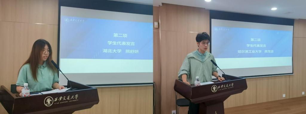 湖北大学的熊舒妍同学和哈尔滨工业大学的龚茂源同学,分别分享了自己在暑期学校的收获与感悟。熊舒妍讲道,作为汉语言文学专业的学生,这次暑期学校的学习,让她对专业有了更深的认知。文学与历史、艺术本就一脉相承,在这里,看到了文化的多元载体,懂得了要从更广阔的人文视野去理解文学、传承文化。龚茂源表示,很高兴能够在这个暑假遇见各位优秀的老师、同学,遇见经历无数历史更迭的西安,这个夏天的记忆将一直珍藏心间。
