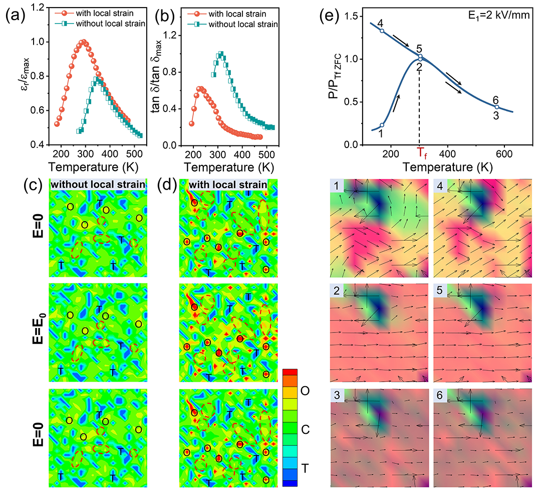 图2 (a-b)引入局域应变场和不引入局域应变场条件下的归一化介电常数εr和介电损耗tan δ温度依赖曲线。(c-d)无局域应变场和有局域应变场时,小电场诱导微观纳米畴结构的演化。(e)有局域应变场时,多相共存纳米畴的零场冷和大场冷却条件下的极化响应的温度依赖曲线及相应的畴结构演化过程。
