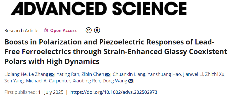 上述研究成果近期以《Boosts in Polarization and Piezoelectric Responses of Lead-Free Ferroelectrics through Strain-Enhanced Glassy Coexistent Polars with High Dynamics》为题,发表于国际权威期刊《Advanced Science》。西安交通大学物理学院、前沿院为第一通讯单位,何利强助理教授为论文第一作者,张乐特聘研究员为论文共同一作和通讯作者。共同通讯作者还包括陈子斌教授(香港理工大学)和王栋教授(前沿院)。