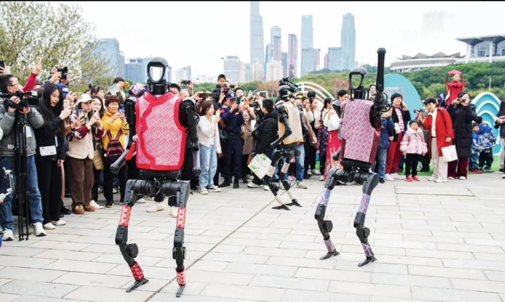 ▲农历三月初三,广西南宁的欢庆活动中穿着壮锦的宇树机器人跳起“广西科目三”中新社陈冠言/摄